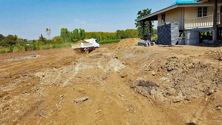 지난 3년 동안 저는 여자친구가 아버지가 준 땅에 집을 짓는 것을 도왔습니다. 우리는 충전물이 있는 150대의 트럭으로 토지를 경작하기 시작했습니다. 이 비용은 트럭당 12.50유로에 트랙터를 위한 500바트를 더하여 평평하게 만들었습니다.