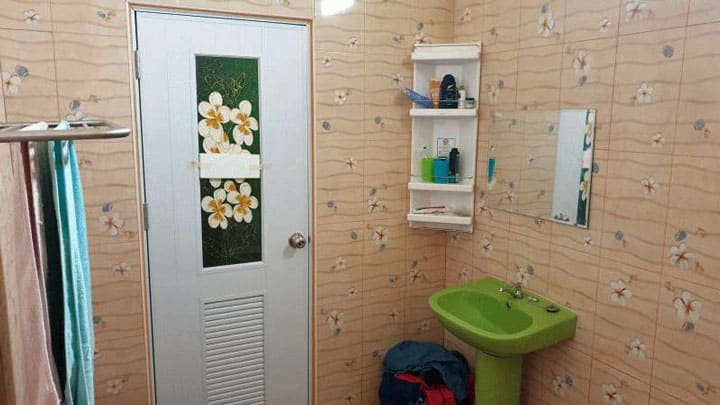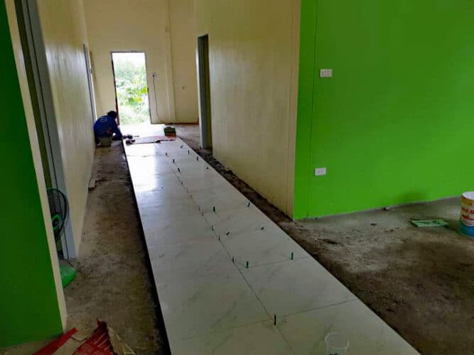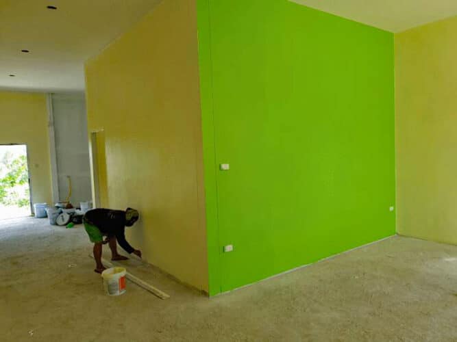 15,000바트에 내부와 외부를 페인트 칠하고 15,000바트에 모든 타일을 배치했습니다. 바닥(220m2)과 2개의 욕실 벽이 모두 있습니다.