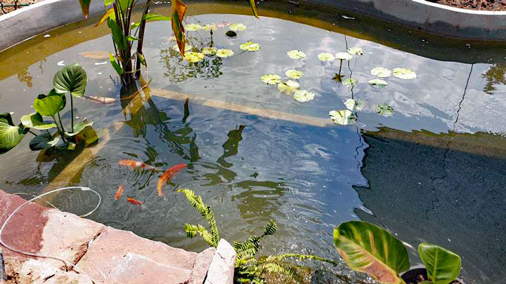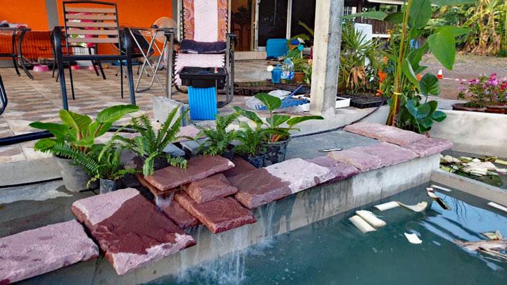 연못도 만들었는데, 흙으로 된 무언가가 남아 있었습니다. 제작자가 먼저 직사각형 탱크를 만들었기 때문입니다. 하지만 저는 다소 자연스러운 진행을 원했습니다. 그가 직사각형 수조 주위에 그것을 만들었을 때, 수조는 나머지보다 높았고, 그에게 물고기를 벽 너머로 옮기는 방법을 물었다. 그런 다음 직사각형 컨테이너의 일부를 예로 들어 봤습니다. 그 후 문제의 남자는 더 이상 주문하지 않았습니다. 마침내 내가 요청한 대로 다른 사람이 그것을 완성했고 이제 직사각형 통이 내부에 있고 펌프와 필터 시스템을 위한 흡입구가 있습니다.