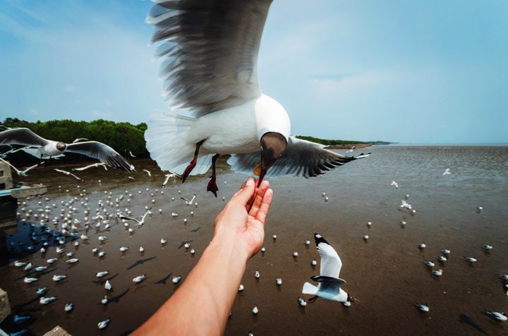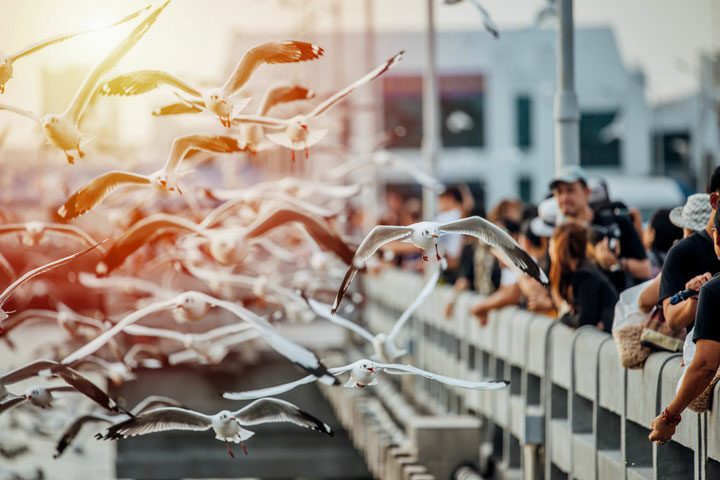 Bangkok Post 웹 사이트에는 방콕의 남쪽 Samut Prakan에있는 Bang Pu의 부두 비디오가 부두 방문자에게 먹이를 준 많은 갈매기를 보여줍니다.