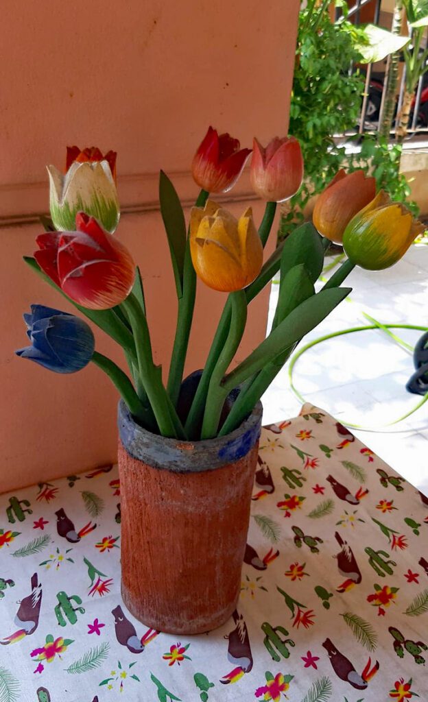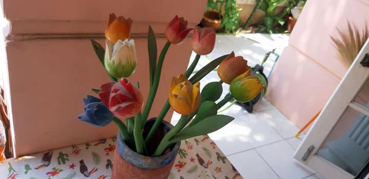 나는 조금 웃어야 했지만 실제로 여기 파타야에 있는 내 집에서도 같은 일이 일어나고 있습니다. 수년 동안 꽃병에는 실제가 아니지만 나무로 만든 다채로운 튤립 꽃다발이 있었습니다. 다육식물과의 차이점은 전체가 알록달록하고 네덜란드의 작은 추억을 대변한다는 점이다. 꽃다발은 암스테르담의 수상 꽃 시장에서 태국인 아내가 구입했습니다. 그녀는 또한 정기적으로 솔질하고 씻어서 튤립을 잘 돌봅니다.