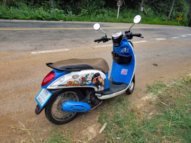 약 3/4시간의 운전 후 스쿠터의 뒷면이 갑자기 약간 이상하게 느껴졌습니다. 타이어 펑크! 나는 스쿠터를 옆으로 치워두고 내 전화를 보니 신호가 없습니다. 나는 실제 마을 근처에 있지 않았고 그렇게 빨리 도움을 찾을 수 없었습니다. 지나가는 차량이 거의 없었습니다. 마침내 태국 가족은 무슨 일이냐고 묻기 위해 멈춰 섰다. 그들이 영어를 한 마디도 하지 않았기 때문에 나는 그렇게 받아들일 것입니다. 나는 그들에게 펑크난 타이어를 지적하고 집주인의 전화번호를 주었다. 그들은 또한 도달하지 못했습니다 …