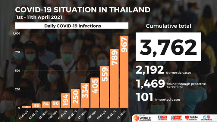 태국의 Covid-19 감염 건수는 영국 변종도 확산되면서 빠르게 증가하고 있습니다. 현재 감염이 증가하는 지역은 62 개입니다. 질병 통제 부서는 토요일에 789 개의 새로운 감염을 발표했습니다. 일요일에는 968 건의 새로운 감염이 발생했으며, 이는 24 시간 동안 기록 된 가장 높은 수치입니다. 이로 인해 대유행이 시작된 이후 총 감염 건수가 32,625 명으로 늘어났습니다.